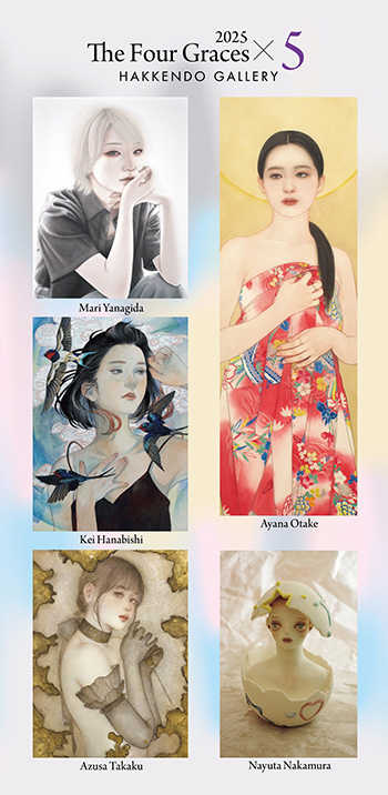★四美神×5  ミュシャが好んだ「四」の数字をテーマとした展覧会「四美神」。 今年は5名の作家に、各々掲げたテーマで制作いただきました。 大竹彩奈は「日本の赤」、 久梓は「CMYK」、 中村那由多は「おいしいもの」、 花菱慧は「4つの恵み(空、海、森、山)」、 柳田真理は「月の満ち欠け」がテーマとなっています。 5人の作家の魅力が存分に発揮された美しい女神の作品をぜひご覧ください。 ■作家作家 ●大竹彩奈/埼玉県生まれ。 東京藝術大学大学院美術研究科博士後期課程美術専攻日本画研究領域修了。 2018年個展(日本橋三越/以降'20、'24) 2019年資生堂クレ・ド・ポー ボーテ コラボパッケージ発表。 ●高久梓/東京都生まれ。 女子美術大学日本画専攻専攻卒業、卒業制作研究室特別賞。第21回佐藤太清賞公募美術展入選。 2019年個展(一兎庵/以降'22。) 2021年「美人画づくし参」掲載。 ●中村那由多/東京都生まれ。 東京藝術大学美術学部彫刻科卒業。藝大の猫展入賞。第18回「人・形」展公募入選。 2021年個展(八犬堂)。 2024年資生堂『マジョリカ マジョルカ』プロモーションドール制作。 ●花菱慧/東京都生まれ。 東海大学工学部生命化学科 卒業。 2017年KENZANみうらじろうギャラリー賞・新人賞。 2023年美人画づくし和装篇刊行記念展(東京美術倶楽部/秋華洞)。 2024年個展(日本橋三越)。 ●柳田真理/埼玉県生まれ。 明星大学造形芸術学科日本画専攻卒業。 2019年KENZAN池永康晟賞受賞。 2021年美人画づくし参刊行記念展(秋華洞)。個展(八犬堂)以降'22、'23 9月22日(月)正午からkonoyo.netにて予約申込みをスタート。 申し込み締め切りは翌朝10時まで。 事前に複数お申込みのあった作品のみ抽選とさせていただきます。 ※お申し込みのなかった作品は会期初日11時より通常販売いたします。 ※WEBでは会期中PM8時〜AM10時までkonoyo.netでも販売します。 ..................................................................................................................