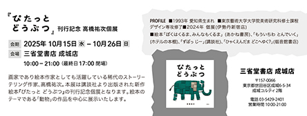 ★高橋祐次個展「動物と本」  画家であり絵本作家としても活躍している稀代のストーリーテリング作家、高橋祐次。 本展は講談社より出版される新作絵本『ぴたっと どうぶつ』の刊行記念個展となります。 絵本のテーマである「動物」、そして書店にちなんで「本」をテーマにした作品を中心に展示いたします。 ■1993年 愛知県生まれ ■東京藝術大学大学院美術研究科修士課程デザイン専攻修了 ■2024年 個展(伊勢丹新宿店) ■絵本「ぼくはくるま、みんなもくるま」 (あかね書房)、「もういちわとんでいく」(ホテルの本棚)、 「ずぼっ じー」(講談社)、「ひゃくえんだま どこへゆく?」(福音館書店) ..................................................................................................................