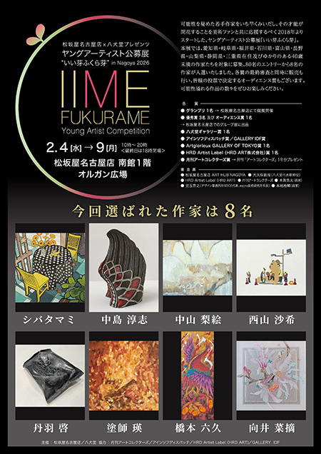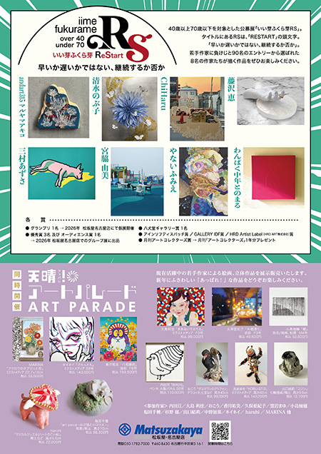 ★いい芽ふくら芽 別企画 “いい芽ふくら芽RS(アールエス)” ![]() 40歳以上70歳以下を対象とした公募展「いい芽ふくら芽RS」。 タイトルにあるRSは、「RESTART」の頭文字。「早いか遅いかではない、継続するか否か」。 若手作家に負けじと90名のエントリーから選ばれた8名の作家たちが描く作品をぜひお楽しみください。 andart315マルヤマアキコ/清水のぶ子/ChiHaru/藤沢 恵/三村あずさ/宮脇 由美/やないふみえ/わんぱく中年とのまる □各賞 ● グランプリ 1名 → 2026年 松坂屋名古屋店にて個展開催 ● 優秀賞 3名 及び オーディエンス賞 1名 → 2026年 松坂屋名古屋店でのグループ展に出品 ● 八犬堂ギャラリー賞 1名 ● アインソフディスパッチ賞 /GALLERY IDF賞 /HRD Artist Label (HRD ART株式会社)賞 ● 月刊アートコレクターズ賞 → 月刊「アートコレクターズ」1年分プレゼント