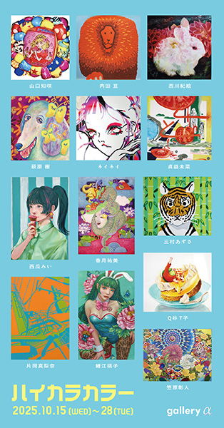 ★ハイカラカラー ![]() 街の彩りが豊かになる秋、会場が色づくようなカラフルな作品を展示いたします。 才能あふれる若手作家たちのハイカラでカラフルな作品をぜひ会場にてご覧ください。 ■出品作家 (五十音順・敬称略) 内田 亘 / 笠原 彰人 / 片岡 真梨奈 / 香月 祐美 / Q谷 T子 / 鯉江 桃子 / 貞益 未菜 西瓜 みい / 西川 紀絵 / ネイネイ / 萩原 樹 / 三村 あずさ / 山口 知咲 ..................................................................................................................